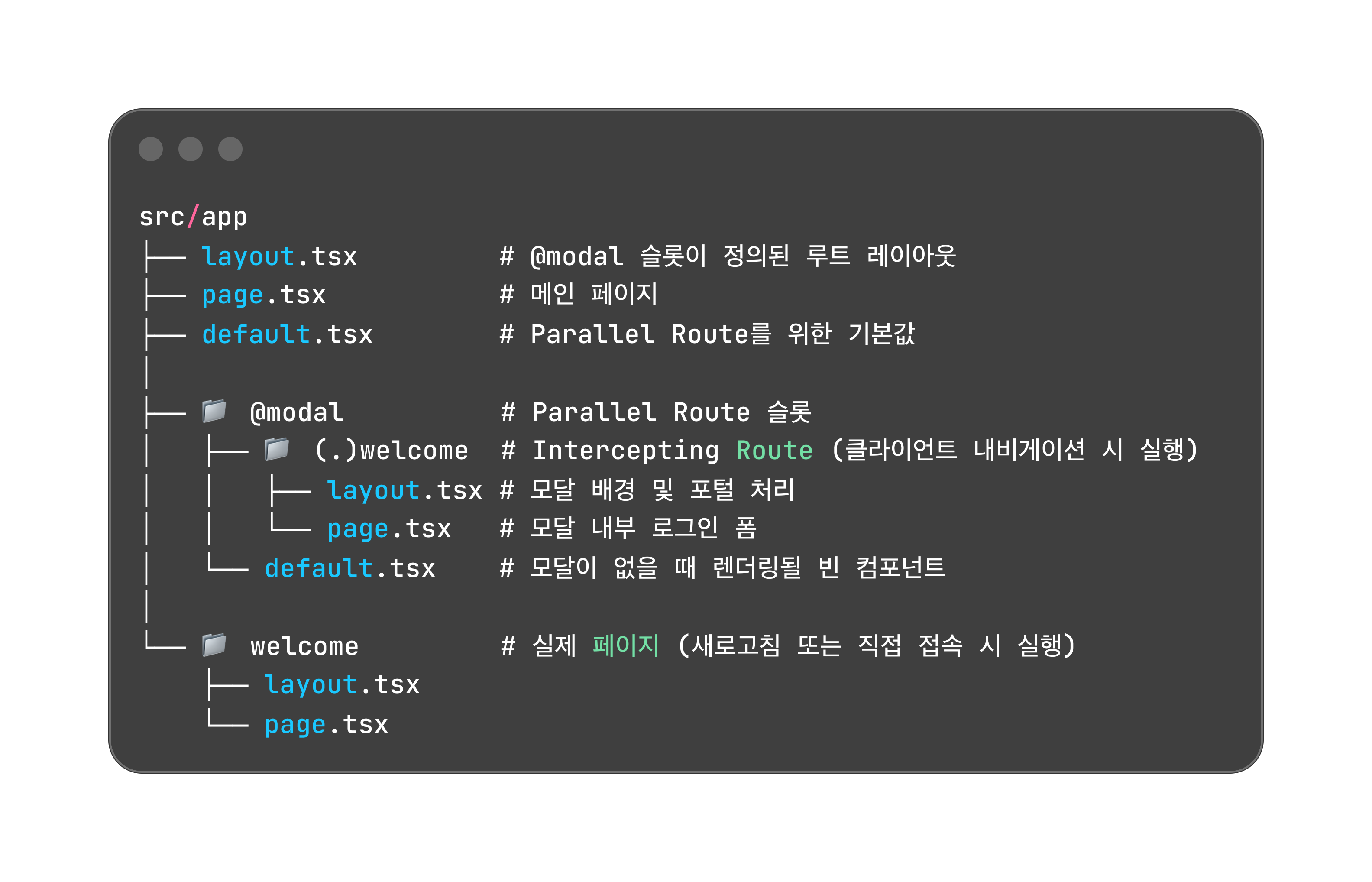 Next.js의 Parallel Routes와 Intercepting Routes를 결합하여, 유저가 기존에 보던 화면은 유지하면서 주소창과 상위 레이어만 로그인 폼으로 교체하는 구조를 채택했다.