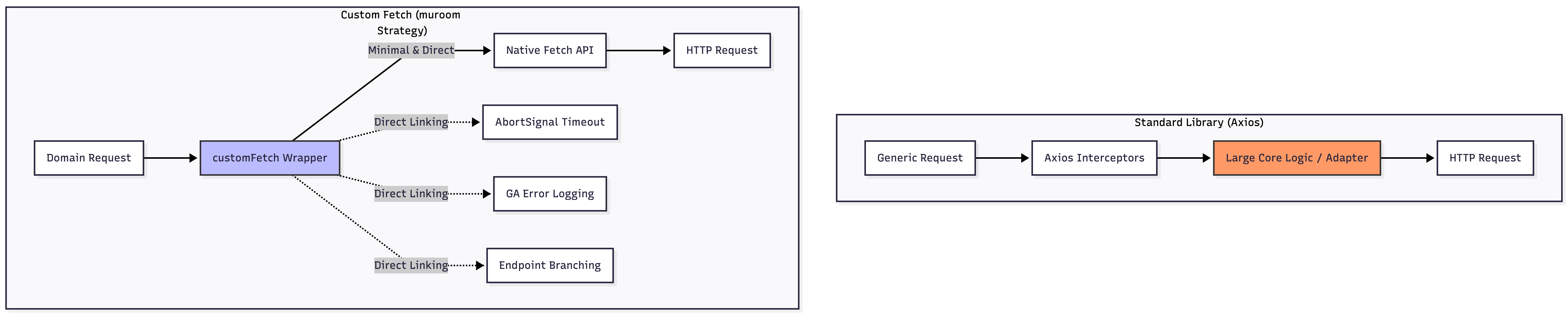 프론트엔드 아키텍처에서 API 통신은 단순히 데이터를 가져오는 행위를 넘어, 불확실한 네트워크 환경 속에서 데이터의 무결성을 보장하고 통신의 가용성을 주도적으로 통제하는 과정이다. Next.js 공식 문서 역시 서버 측 호출 시 fetch 사용을 권장하며, 프레임워크의 핵심 예제들 또한 fetch를 표준으로 삼고 있다. muroom 프로젝트는 이러한 기술적 지향점에 발맞추어 기성 라이브러리인 Axios에 의존하지 않고, 브라우저와 Node.js 표준인 Fetch API를 래핑한 customFetch 를 직접 설계하여 통신의 신뢰도를 높였다.