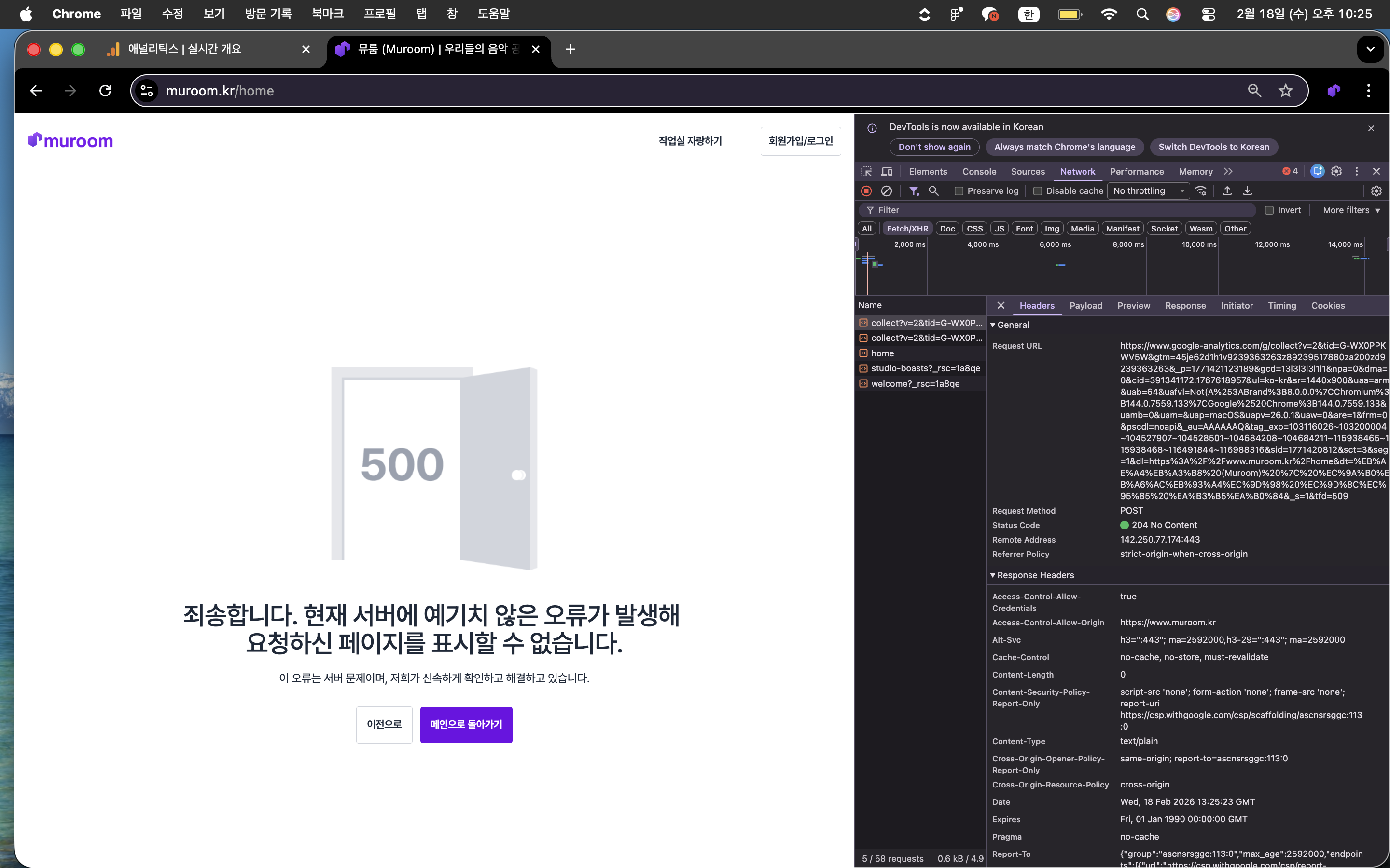 📸 커스텀 500 에러 UI 렌더링과 동시에 GA4 'collect' 신호(204 Status)가 발생하는 실제 화면