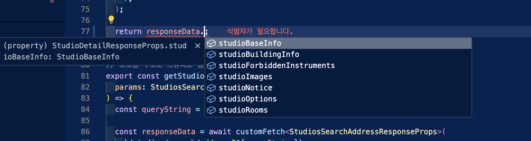 📸 responseData. 입력 시 정의된 인터페이스 필드들이 즉시 자동 완성되는 인텔리센스 화면