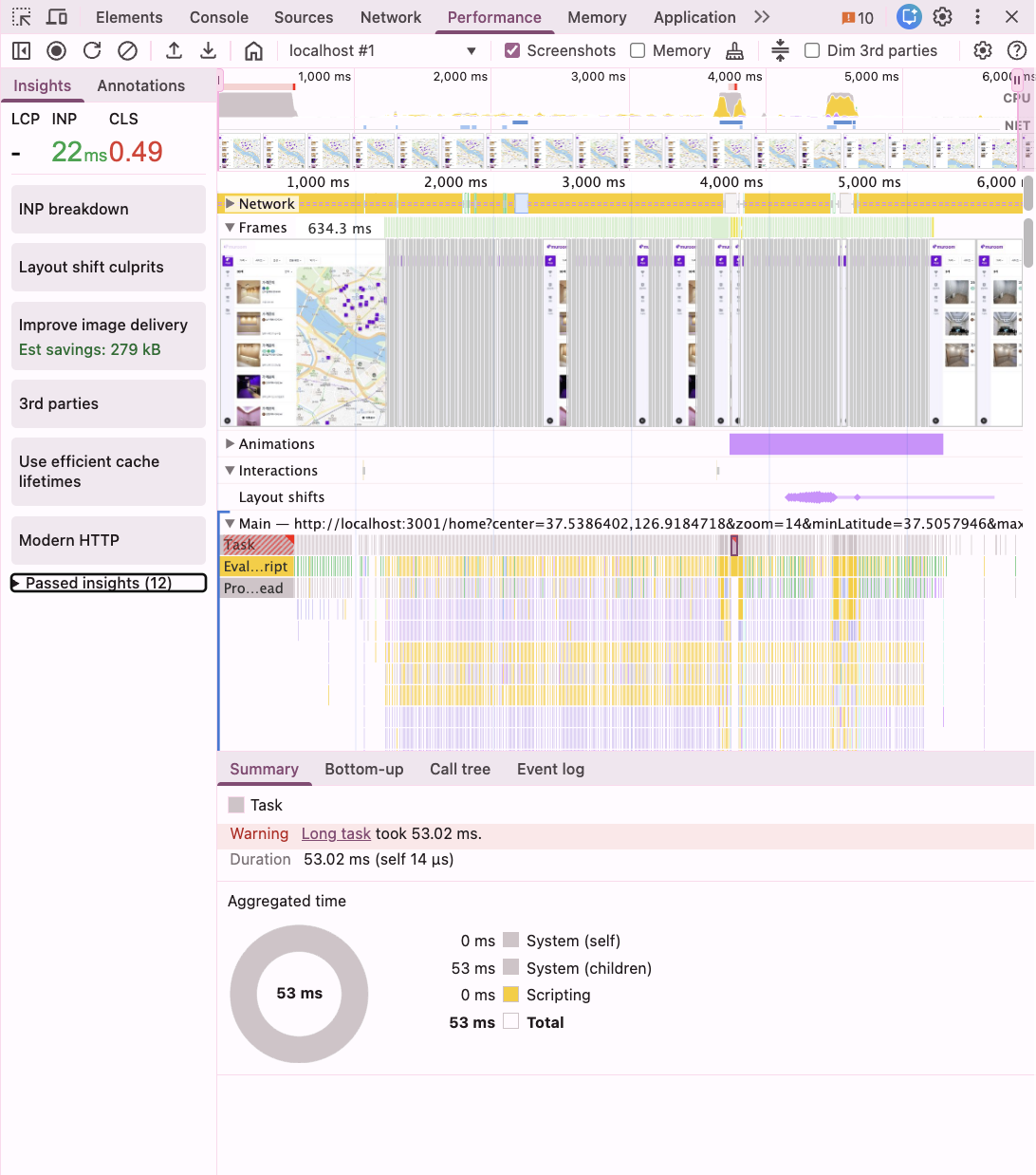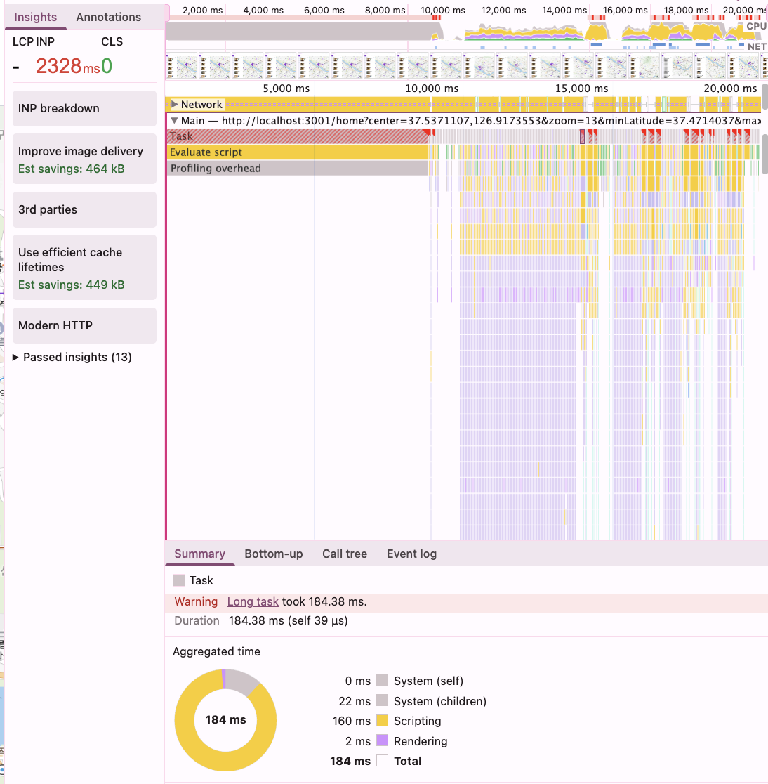 rAF 적용 전 로컬 환경에서는 지도가 멈출 때마다 강제 레이아웃 재계산이 발생하여 메인 스레드가 완전히 차단되었다. 특히 INP 2,328ms라는 숫자는 드래그 후 화면이 반응하기까지 2초 이상 걸린다는 심각한 지표였으며, 이는 사실상 인터랙션이 불가능한 수준임을 시사한다.