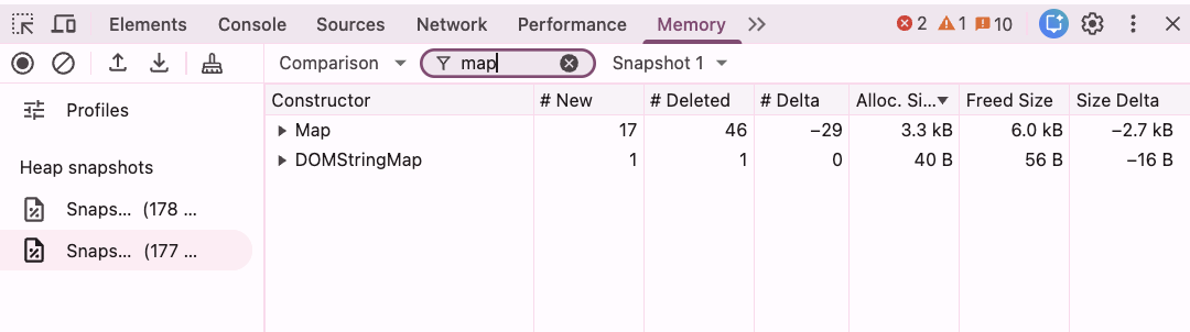 페이지 이탈 후 힙 스냅샷 비교: Map 관련 객체의 # Delta가 음수(-29)를 기록하며 자원이 회수된 모습