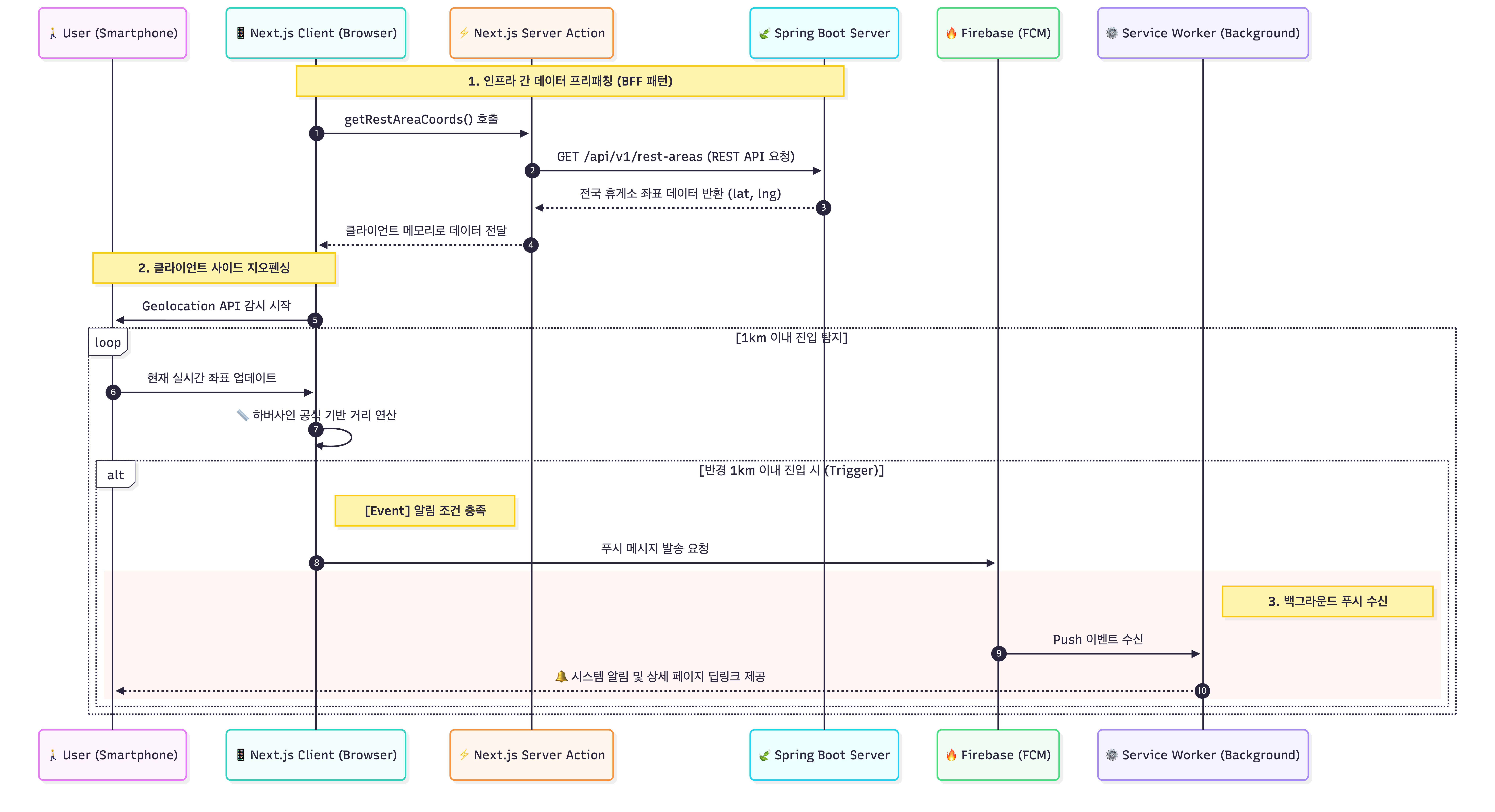 보안 및 효율성: 브라우저에서 직접 Spring Boot 서버에 접근하지 않고, Next.js Server Action을 중간 프록시(BFF)로 활용했습니다. 이를 통해 API 키 노출을 방지하고, 초기 구동 시 전국 휴게소 좌표 데이터를 안전하게 프리패칭하여 클라이언트 메모리에 로드했습니다.
