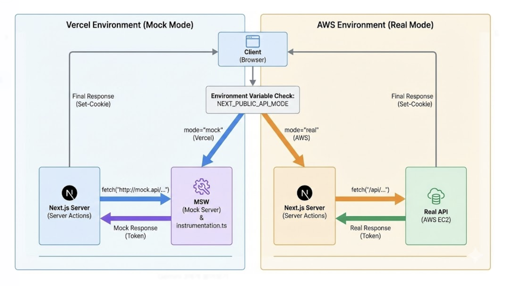 packages/widget)를 구축했습니다. 이를 통해 위젯의 기능 확장이 앱 전체 빌드 성능에 주는 영향을 차단하고, 시스템의 뼈대가 되는 '그리드 엔진'의 독립적인 테스트 환경을 확보했습니다.NEXT_PUBLIC_API_MODE 환경 변수에 따라 Vercel(Mock Mode)과 AWS(Real Mode)를 유연하게 스위칭합니다. 특히 Vercel 환경에서도 MSW와 instrumentation.ts를 활용해 실서버와 동일한 인터페이스를 검증할 수 있는 모킹 전략을 수립했습니다.